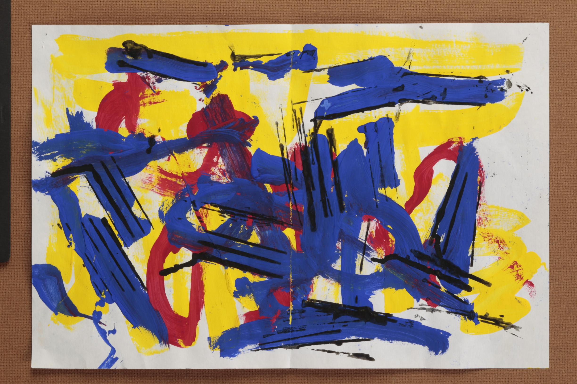 Set on a white background, Madisyn’s tempura painting is an interplay of bold brushstrokes in red, yellow and blue with black lines for emphasis.