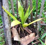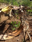 — In layers: compost soil, then grassy materials like old pulled weeds and last, a good technique if you have plenty of banana trees like El Yunque, place banana tree cuttings on top of mulch to provide constant watering. Banana trees are useful because when harvesting the fruit, you must chop down the entire tree. New saplings grow from the stumps of old trees. Once a tree is chopped down, you can use the leaves for both shading sprouts and nutrient-heavy mulch and then the trunk can be used for watering. The trunk is incredibly heavy, chock full of gallons of milky water. So you chop up the trunk into smaller chunks then pull off layers (like an onion) and place on top of your mulch.