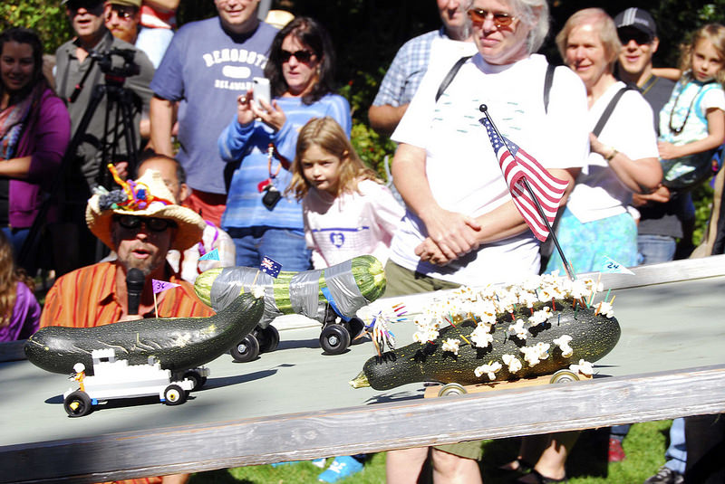 After a multi-year hiatus, a crowd of Bainbridge islanders showed up for the return of the Great Zucchini Races to the Bainbridge Island Farmer’s Market Saturday. The race has been a Bainbridge staple since the 1980s. Participants of all ages get creative in building zucchini mobiles of all shapes and sizes.